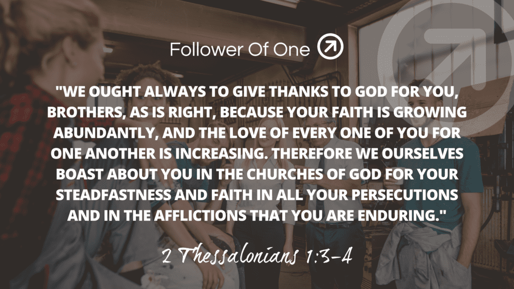 “We ought always to give thanks to God for you, brothers, as is right, because your faith is growing abundantly, and the love of every one of you for one another is increasing. Therefore we ourselves boast about you in the churches of God for your steadfastness and faith in all your persecutions and in the afflictions that you are enduring.” 2 Thessalonians 1:3-4