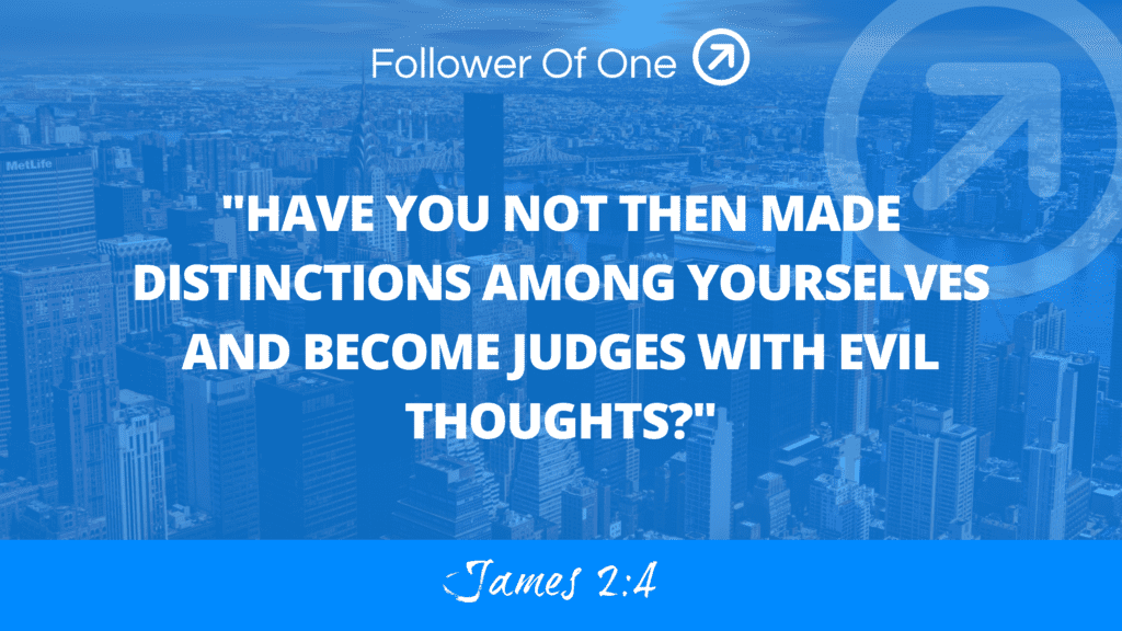 James 2:3-4 and if you pay attention to the one who wears the fine clothing and say, “You sit here in a good place,” while you say to the poor man, “You stand over there,” or, “Sit down at my feet,” have you not then made distinctions among yourselves and become judges with evil thoughts? (ESV)